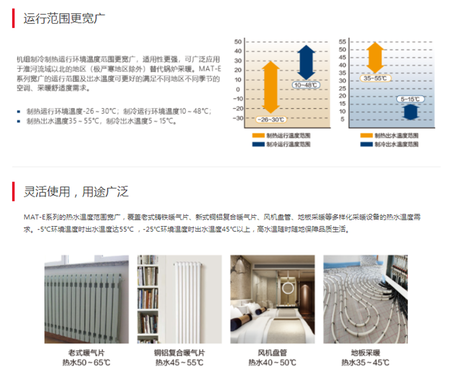 日立MAT-E系列低溫強熱型空氣源熱泵(冷水)機組,采用補氣增焓壓縮機,實現低溫環境下強勁制熱。機組采用R410A環保冷媒,綠色低碳環保,可16模塊自由組合,最大組合容量制冷量1040kW,可靈活應用于寫字樓、醫院、賓館、酒店、商場、展廳等場所,滿足大空間的空調使用需求。